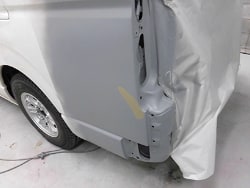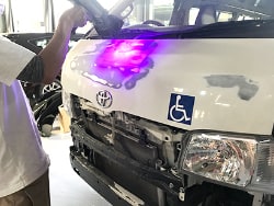 後方の事故の損傷時、リヤガラスが割れて飛散する場合がございます。 そんな時は、自社鈑金塗装工場に福祉車輌取扱士がいる当社なら、リフト部分や固定装置を分解して隅々まで清掃し、点検することが可能です!